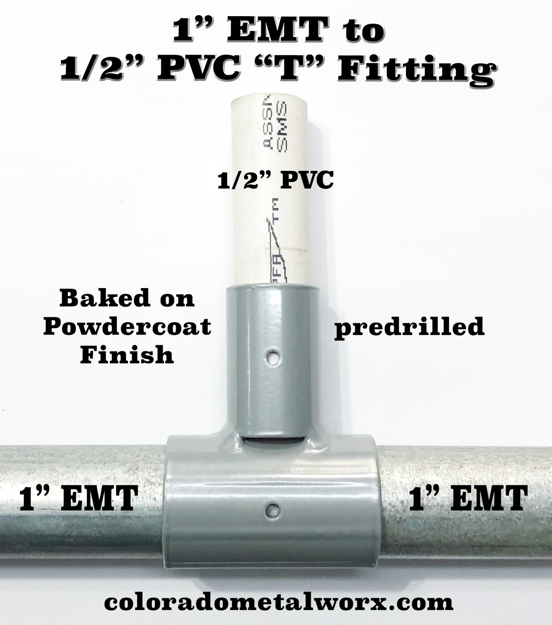 Our 1" EMT to 1/2" PVC "T" Fittings solves the problem of connecting PVC plastic pipe to 1" Steel tubing.